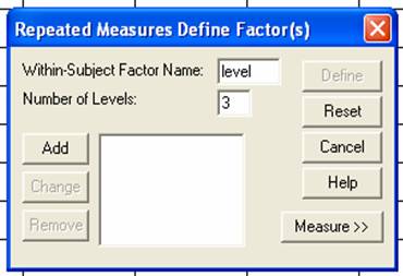 word “level(3)” in the window. This tells SPSS that there is one IV that I