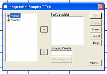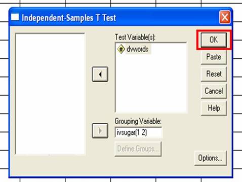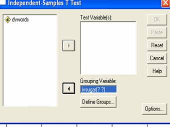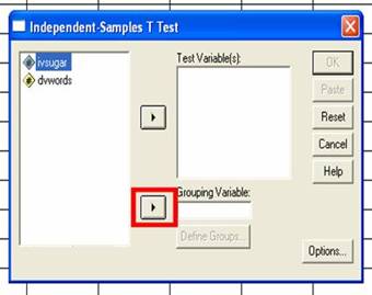 After defining your groups, you will go back to the box you had been working in. You have already moved the IV to the appropriate place. Now it’s time to move the DV. You want to move the DV to the Test Variables box. To do this, click on the variable name to highlight it. Then, click on the arrow button that is next to the Test Variables box.