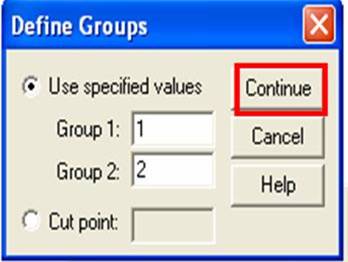A tiny Define Groups Box will appear. You want to fill in the blank for the empty box next to Group 1 and Group 2. SPSS wants to know two things here. What number did you use to represent Group 1 in the data file? That is, what number did you use to represent the first condition? Also, what number did you use to represent Group 2 in the data file? That is, what number did you use to represent the second condition?