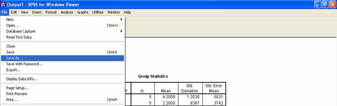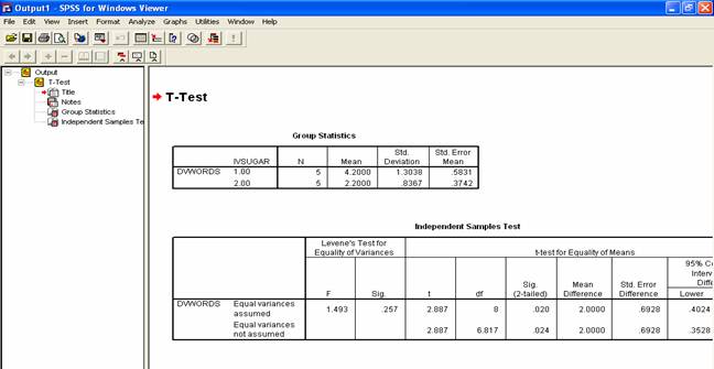 Make sure you save your results to a meaningful place and with a meaningful name. You can do this by clicking File and then Save or Save As. I will choose the name “Effect of Sugar on Words Remembered Output.spo” This name makes it easy for me to remember the experiment and helps me to see that these are the results (output), not the data.